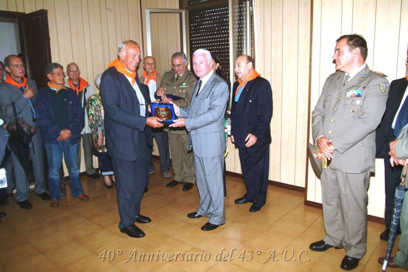 | 133 | Il Capo Batteria del 43° A.U.C., Giovanni Sormani, consegna il "CREST", Ricordo del Raduno,al Gen. Antonino Mozzicato, Presidente della Sezione A.N.Art.I. di Bracciano. | ||||||||||